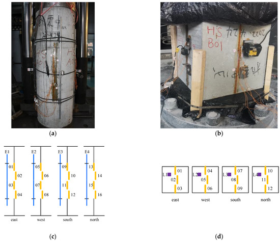 The size of the axial tension specimen is Φ450 mm × 1470 mm. The specimen is embedded with eight rebar with 32 mm diameter at each end, and the embedding depth is 300 mm. The length of exposed rebar was 60 mm and the screw was machined to a diameter of 22 mm. The arrangement of strain gauges and high-precision extensometers was used to measure the deformation of the specimen, as shown in Figure 1a,c. The strain gauges were arranged on the four sides of the specimen, which were pasted in the axial direction, and each group consisted of 4 strain gauges with a length of 150 mm and the total measuring distance of 660 mm. Four extensometers were arranged in the vicinity of each group of strain gauges, and a total measuring distance was 660 mm. The size of the axial compression specimen used in this study is 450 mm × 450 mm × 450 mm, and strain gauges were used to measure the deformation, as shown in Figure 1b,d. Three 150 mm-long strain gauges and one laser displacement sensor were arranged vertically on each side, for a total of twelve strain gauges and four laser displacement sensors, where the end constraints were as removed by two layers of plastic film and three layers of butter constraints.