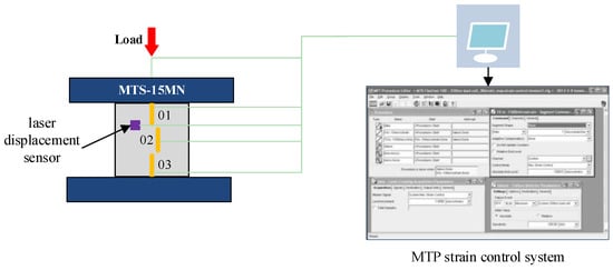 For the axial tension test, in order to obtain a complete fully-graded concrete stress–strain curve and capture the damage location, the maximum strain control mode was used in this paper. The maximum value of the 16 strain gauges was used as a control signal to control the loading rate. The schematic diagram of axial tension test is shown in Figure 3. For axial compression test, in order to obtain a complete fully-graded concrete stress–strain curve, the maximum strain control mode was also used in this paper. The maximum value of the 12 strain gauges was used as a control signal to control the loading rate. The schematic diagram of axial compression test is shown in Figure 4.