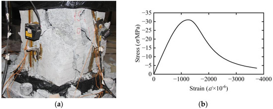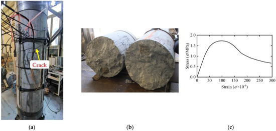 For the axial compression test, the specimen was crushed with a gradual increase of load. The damage state of the compression specimen and the full stress–strain curve are shown in Figure 6. The peak strain is 1248.13 × 10−6 and the peak stress is 31.04 MPa.