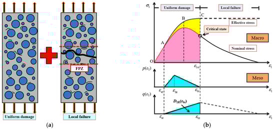 Deformation and failure process of concrete under axial tension: (a) two-stage deformation and failure characteristics; (b) relationship between mesoscopic damage mechanism and macroscopic nonlinear stress–strain behavior.