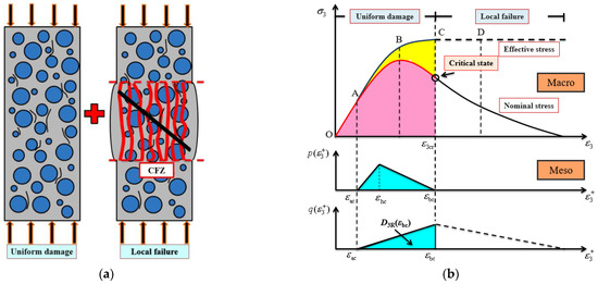 Deformation and failure process of concrete under axial compression: (a) two-stage deformation and failure characteristics; (b) relationship between mesoscopic damage mechanism and macroscopic nonlinear stress–strain behavior.