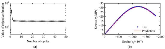 For the axial tension test, the modulus of elasticity is 3.55 × 104 MPa, and the optimal parameters of , , and are 0.0495, 0.2488, 1.4423 and 0.2663, respectively; for the axial compression test, the modulus of elasticity is 3.55 × 104 MPa, the optimal parameters of , , and are 0.6548, 2.6848, 3.6711 and 0.4965, respectively. Figure 10 and Figure 11 show the optimization process of axial tensile and compression parameters, and the comparison curves of test and fitting results. It can be seen that the ABC method is able to converge to the optimal result very quickly, and the nominal stress–strain curves predicted by the model are in good agreement with the experimental curves. This validates the effectiveness of the methodology in this article.