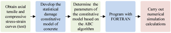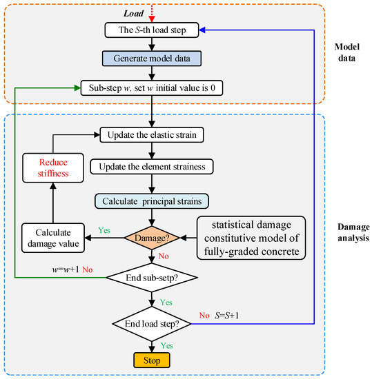 The numerical implementation process of the model can be divided into two parts: (1) the establishment of the physical model and attribute assignment; (2) the finite element method solution, including the displacement field, stress field, strain field, etc. Then the evolution of the mesoscopic damage of the element is analyzed. Figure 12 shows the numerical analysis process and calculation scheme. The detailed steps are as follows: