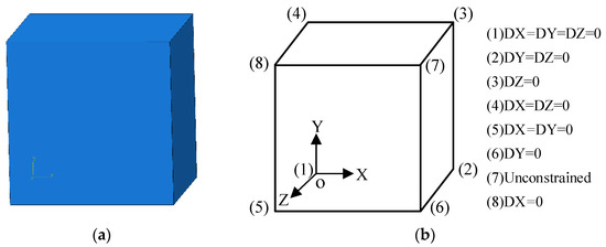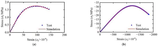 Figure 13 gives the overall numerical simulation idea of fully-graded concrete constitutive model. First, the full stress–strain curves are obtained by axial tensile and compression tests, then the SDM of fully-graded concrete is established, the main parameters of the constitutive model are determined based on the ABC algorithm, and finally the FORTRAN subroutine is compiled to realize the numerical simulation calculation. In order to verify the accuracy of the proposed numerical simulation method, a finite element model with a single element is established, as shown in Figure 14a, while Figure 14b shows the boundary conditions. The uniaxial, biaxial, and triaxial forces are analyzed. It should be noted that the compression and tension modulus of elasticity are assumed to be the same, and Poisson ratio is 0.2 during the numerical simulation.