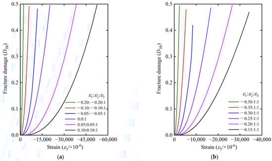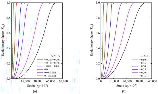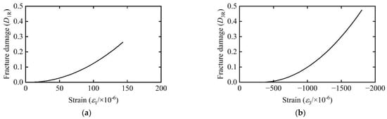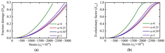 characterizes the degree of optimized adjustment of the microstructure load skeleton and the potential load-bearing capacity. When = 0, it corresponds to the initial state without damage. And when = 1, it corresponds to the critical state with all microbars in the model yield, and the adjustment of the load skeleton is optimized to reach the maximum value. When reaches its maximum value, the model is about to enter the stage of local destruction. It should be noted that the relevant parameter in the above equation is subscripted as 1 for axial tension, and the relevant parameter in the above equation is subscripted as 3 for axial compression.