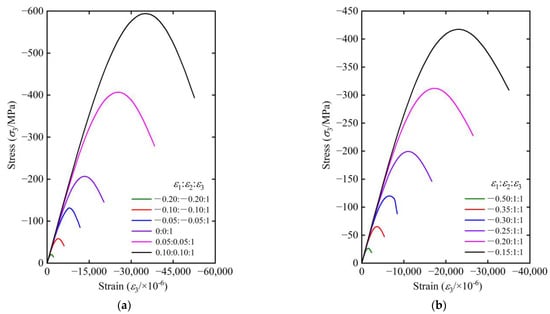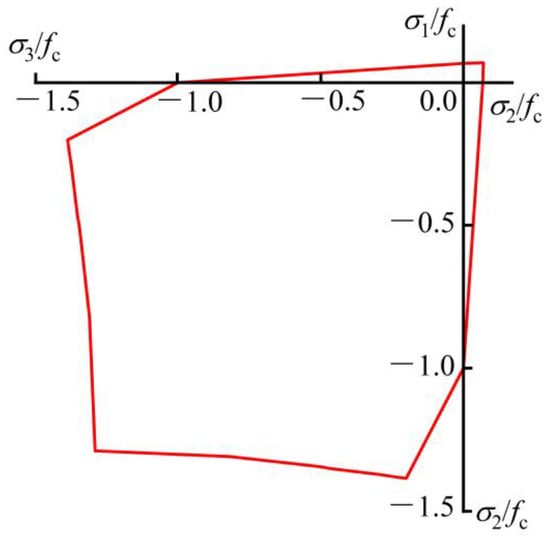 Fully-graded concrete is a widely used complex nonhomogeneous material in the construction of water conservancy infrastructure—such as gravity dams and arch dams—which consists of cement, aggregate, water and admixture. Compared to conventional concrete particle size, the aggregate size of fully-graded concrete can be up to 150 mm [1]. Concrete has good compressive properties; however, fully-graded concrete structures in real environments are often under multiaxial stresses. The mechanical properties under multiaxial stresses are different compared to uniaxial mechanical properties. The mechanical properties of fully-graded concrete under multidirectional compression have received attention from scholars, and relevant experimental and theoretical research has been carried out [2,3,4]. The full curve of concrete stress–strain characterizes the whole process of concrete from the beginning of deformation—gradual damage to the final destruction—which can comprehensively reflect the strength and deformation properties of concrete. The multiaxial stress–strain constitutive relationship is the basis for the refined numerical analysis of the entire process of concrete structures subjected to external loads [5,6]. Since specimens with large-size aggregates are usually larger in size and have higher requirements for the corresponding testing equipment, there are only a limited number of researchers who can carry out the relevant tests. Adopting numerical simulation methods to study the properties of concrete structure, in combination with the relevant test results, to establish a contact between the mesoscopic damage evolution mechanism and the macro mechanical properties, has become one of the research directions of interest to current scientific workers. Therefore, the study of numerical simulation models that can reflect the multiaxial force state of fully-graded concrete is significant for more effective nonlinear analysis and the structural design of large-scale water conservancy projects.