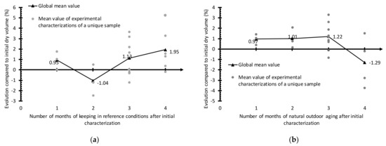 The dry thermal conductivity evolution of samples held under curing conditions is presented in Figure 15a. It can be observed that the samples maintained under reference conditions after initial characterization display a random dry thermal conductivity evolution throughout conservation, with this evolution being characterized by a low mean variation. More specifically, the average values obtained are −0.85% after 1 month, +2.64% after 2 months, +1.02% after 3 months, and +1.22% after 4 months. The maximum variation observed for a single sample is +6.89%, while the typical thermal conductivity variation range equals ±5% over the entire conservation: 13 of 16 samples in this evolution range. The number of samples whose dry thermal conductivity increased during conservation equals the number of samples whose dry thermal conductivity decreased, i.e., eight in each case. Lastly, for this conservation sequence, no correlation can be drawn between the dry thermal conductivity evolution and the initial density of the characterized samples. The described evolution typically corresponds to a measurement error, most likely due to the choice of different measurement points between the first and second characterizations and not due to any real physical variation in the property. Under these conditions, and over these given periods, it can be concluded that the material maintains its thermal insulation capacities, which is critical since the material was specifically designed as a thermal insulator.