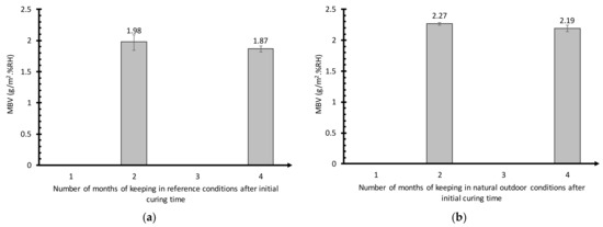 The mean MBV after natural outdoor exposure seems to increase relative to the initial campaign value. It can be noted that the mean MBV (Figure 17b) of the samples studied herein lies above 2 kg/m2.%RH, i.e., 2.27 kg/m2.%RH after 2 months and 2.19 kg/m2.%RH after 4 months. With this value range, the mean MBV of the hemp concrete samples is positioned in the “excellent” category of materials for MBV, which includes all materials over 2 kg/m2.%RH. As the mean MBV increased, it may be concluded that the applied ageing has an impact on this property, as reflected by the increase; however, such a conclusion must be considered carefully. As with the reference conservation, the values lie within the initial campaign measurement error range, albeit at the very top of the range.