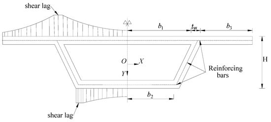 The uneven distribution of bending stress along any cross section of a thin-walled box girder and the non-uniform longitudinal stress distribution in the flange at the web-flange connection due to shear interaction result in what is known as the shear lag effect [1,2]. The shear lag effect is widely observed in various engineering structures, for example, beam structures, bridge engineering, and concrete structures [3,4,5,6,7,8]. Neglecting to consider the shear lag effect can lead to two detrimental consequences: an underestimation of vertical deformation in the box girder and an underestimation of peak stress in the wing plate, significantly impacting the applicability and safety of the structure.
