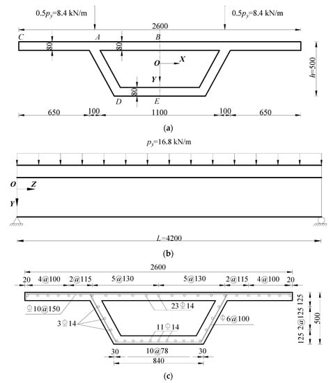The finite element method (FEM) can provide abundant data for comparison with the proposed method (PM). By establishing a finite element model and comparing the results obtained from finite elements with the results obtained from the proposed method and the conventional method, the curve of the results obtained from the proposed method is closer to the curve of the finite element results, so the results of the proposed method are closer to the finite element results, which verifies the validity of the proposed method. In this paper, according to the derivation process of the proposed method, when the variable is eliminated, the resulting analytical solution can be approximated as the analytical solution of the conventional method. The model of a simple box beam was referenced in the literature [35]. Consequently, the data analysis is conducted using the model shown in Figure 3. Figure 3a shows the cross-section of the box girder considered for validation. The simply supported RC box girder has a length of L = 4.2 m and supports a vertically uniformly distributed load of kN/m, as shown in Figure 3b. The load is symmetrically applied to the top surface of the web of the box girder. The layout of the reinforcing steel bars is shown in Figure 3c. The elastic moduli of concrete and steel are 34.5 GPa and 200 GPa, respectively. The weight of the box girder is not considered in the calculations.