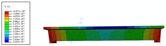Figure 8 shows the details of the simply supported concrete box girder considered in this example. The length is L = 4.0 m, a uniformly distributed load of , which is applied to the top surface of the web along the length direction. The elastic modulus of concrete is 38.1 GPa, and its Poisson’s ratio is 0.2. The weight of the box girder is not considered.