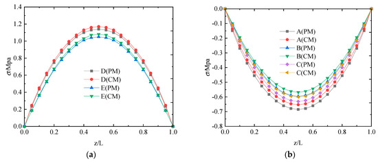 Figure 10 and Figure 11 display the axial stresses and stress difference ratio in each slab of the simply supported box girder, respectively. In these figures, the five positions of A, B, C, D, and E represent the joint between the top slab and the web, the midpoint of the top slab, the edge of the cantilever slab, the joint between the bottom slab and the web, and the midpoint of the bottom slab, respectively. In Figure 10a, the maximum stresses of the A, B, and C obtained from the conventional method are −0.653 Mpa, −0.568 Mpa, and −0.601 Mpa, respectively, while the maximum stresses of the A, B, and C obtained from the proposed method are −0.685 Mpa, −0.596 Mpa, and −0.631 Mpa, respectively. As shown in Figure 10b, the maximum stresses of the D and E obtained from the conventional method are 1.17 Mpa and 1.08 Mpa, respectively, while the maximum stresses of the D and E obtained from the proposed method are 1.14 Mpa and 1.05 Mpa, respectively. As shown in Figure 11, the maximum stress difference ratio of the upper flange along the cross-section is 4.73%, whereas the maximum stress difference ratio of the lower flange is −2.54%. In Figure 11b, in the upper flange, the position with the highest stress is A, reaching a maximum of 7.7%; this ratio at other positions is approximately 4.7%. Consequently, neglecting the axial equilibrium condition results in an underestimation of stress on the upper flanges while overestimating stress on the lower flanges.