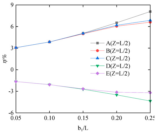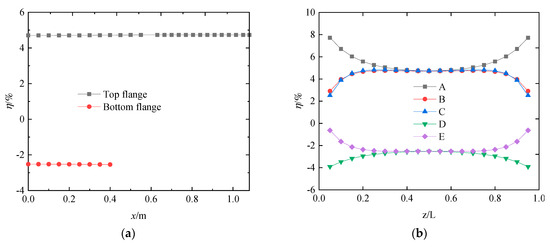 Taking = 55 cm, is 13.75, 27.5, 41.25, 55, and 68.75 cm, respectively. The values of are 0.25, 0.5, 0.75, 1, and 1.25, respectively. As shown in Figure 14a, the stress difference ratios of the upper flange increase with the increase in , reaching a maximum value of 5.6%. As shown in Figure 14, when ranges from 0.25 to 0.75, the stress difference ratios of the lower flange decrease with the increase in , and when ranges from 0.75 to 1.25, the difference ratios of the lower flange increase with the increase in , but the numerical value does not exceed 3%. As shown in Figure 15, the stress difference ratios at five positions increase with the increase in , with the stress difference ratios at A, B, and C being more than 5%. Therefore, the change of affects the stress difference ratios of the upper flange more than the lower flange.