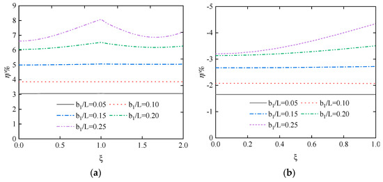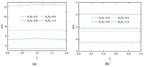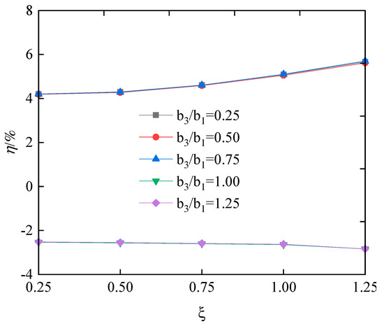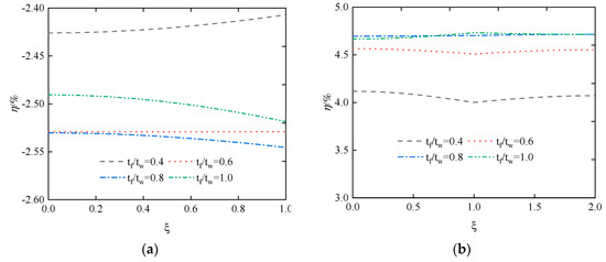 Taking = 8 cm, is 3.2, 4.8, 6.4, and 8.0 cm, respectively. The values of are 0.4, 0.6, 0.8, and 1.0, respectively. As shown in Figure 20, the stress difference ratios of the upper and lower flanges first increase and then decrease with the increase in , but without exceeding 5%. Consequently, the change in has a negligible effect on the change in the difference ratios of both the upper and lower flanges.