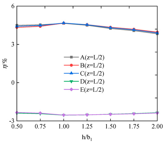 Taking = 55 cm, H is 27.5, 55, 82.5, and 110 cm, respectively. The values of are 0.5, 1.0, 1.5, and 2.0, respectively. As shown in Figure 18, when is in the range 0.5~1.0, the stress difference ratios of the upper and lower flanges increase with the increase of , and when is in the range 1.0~2.0, the stress difference ratios of the upper and lower flanges decrease with the increase in , but without exceeding 5%. As shown in Figure 19, the stress difference values at A, B, C, D, and E first increase and then decrease with the increase in , and also without exceeding 5%. Therefore, the change in has a negligible effect on the stress difference ratios of both the upper and lower flanges.
