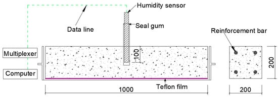 The humidity inside the concrete was measured using a humidity sensor with a 3% accuracy for relative humidity. The humidity sensor is a moisture-sensitive capacitance type, which comprises polymer film capacitors, such as polystyrene, polyimide, and caseinate acetate fiber. When the ambient humidity is altered, the dielectric constant of the moisture-sensitive capacitor changes; thus, its capacitance also changes in proportion to the relative humidity, from which the change in external humidity can be obtained. The humidity sensors were placed 100 mm from the top surface of the concrete to test the humidity changes inside the concrete. To install the humidity sensor inside the concrete, a PVC pipe with an inner diameter of 20 mm and a thin PVC sheet covering the bottom end were used. Two rectangular holes were cut close to the bottom of the PVC pipe to allow the sensors to test the humidity inside the concrete. To prevent fresh concrete from flowing into the PVC pipe during the pouring process, a thin steel pipe with an outer diameter of 20 mm was inserted into the PVC pipe before pouring the concrete. The PVC and the thin steel pipes were inserted 100 mm from the top surface of the mold before the concrete was poured. When the concrete started to set, the thin steel pipe was pulled out, and the humidity sensor was inserted into the PVC pipe. To prevent humidity exchange between the inside of the PVC pipe and the outside environment, the top of the PVC pipe was sealed with a sealant and a polyethylene film (Figure 1).