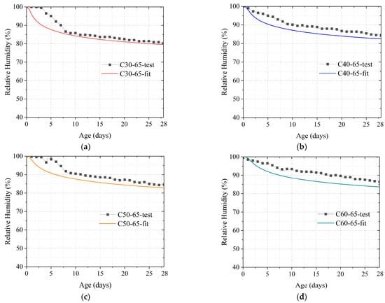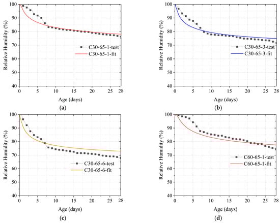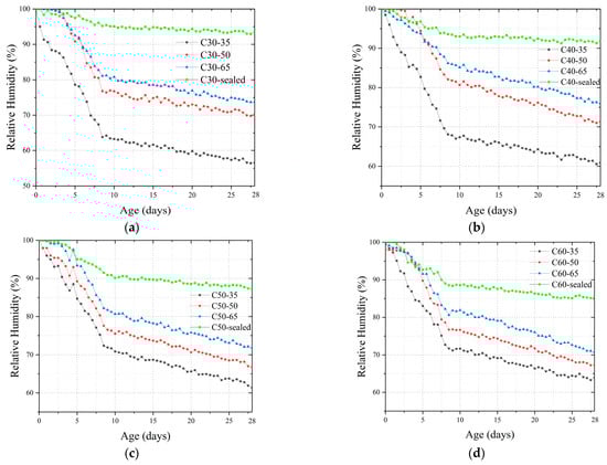 Changes in the internal humidity of concrete: (a) C30; (b) C40; (c) C50; (d) C60.