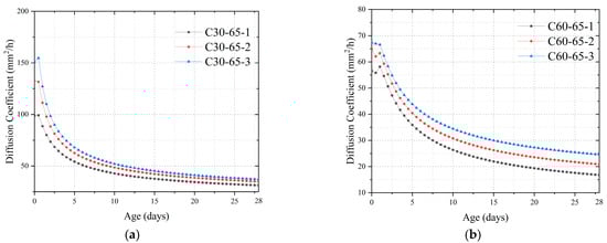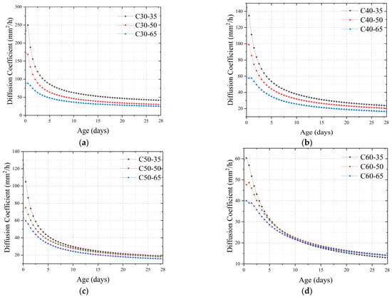 The effect of different concrete strengths on the diffusion coefficient of humidity for the same external ambient humidity condition is depicted in Figure 8. The diffusion coefficient versus time curves for different concrete strengths under the same external humidity conditions reveal that when the concrete strength is higher, the diffusion coefficient under the same external humidity conditions is lower. In the early concrete-formation stage, this difference is quite apparent. This phenomenon is explained below.