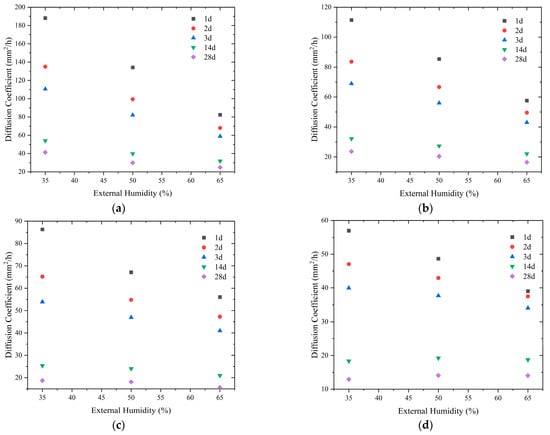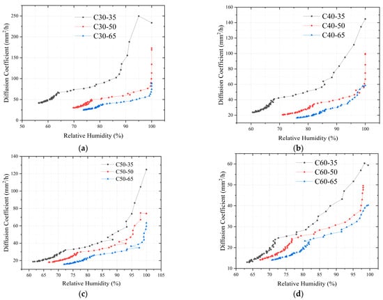 Relationship between moisture diffusion coefficient and external humidity: (a) C30; (b) C40; (c) C50; (d) C60.