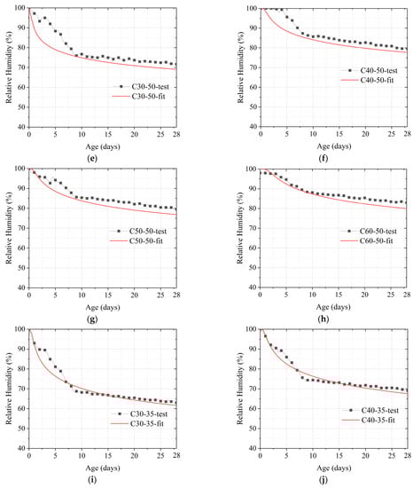 In previous studies, the variation in internal humidity with age under sealed and dry conditions was experimentally obtained for each concrete grade. Therefore, the moisture diffusion coefficient of concrete can be obtained by inverting Equation (34). The decrease in humidity in concrete is due to a combination of cement hydration and drying effects. Therefore, in calculating the moisture diffusion coefficient of concrete, the moisture drop due to concrete hydration should be deducted from the total moisture reduction.