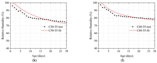 Comparison of calculated and actual internal humidity values of concrete without constraint conditions: (a) C30-65; (b) C40-65; (c) C50-65; (d) C60-65; (e) C30-50; (f) C40-50; (g) C50-50; (h) C60-50; (i) C30-35; (j) C40-35; (k) C50-35; (l) C60-35.