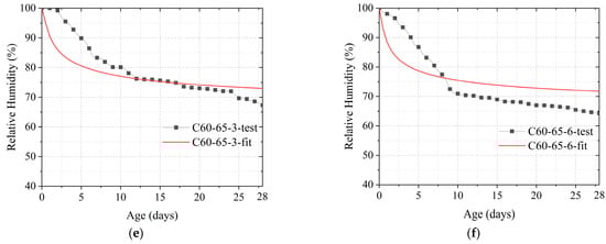 After obtaining the moisture diffusion coefficient of the concrete, the internal moisture can be calculated using Equation (29). In this study, the humidity in the middle of the specimen was determined. Therefore, x = 100 when calculating the internal moisture. Figure 6 and Figure 7 depict the calculated results of the internal humidity of concrete using Equation (29) as compared to the test results. Notably, these test results refer to the results obtained by subtracting the decrease in humidity due to cement hydration (i.e., the humidity test results of the sealed curing specimens) from the humidity test results of the dry specimens. The comparison results reveal that the calculated models are largely consistent with the test results. The average error over the whole age period was approximately 5%. However, while the computational method has better predictions overall, the overall predictions are not sufficient for earlier ages (up to 2 days). The aforementioned may be related to the distortion of the model, which is attributable to the insufficient understanding of the internal humidity of early-age concrete and the selection of the error function. However, the model can generally predict the internal humidity of concrete satisfactorily, and the error results in an amplification of the internal gradient of concrete due to diffusion; thus, the calculation of concrete shrinkage and shrinkage cracking by the humidity is conservative. Therefore, this type of error is deemed acceptable.