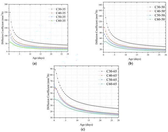 Effect of different concrete strengths on the humidity diffusion coefficient for the same external ambient humidity: (a) RH = 35%; (b) RH = 50%; (c) RH = 65%.