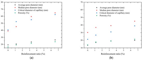 Relationship between reinforcement ratio and pore structure parameters at 28 days: (a) C30; (b) C60.