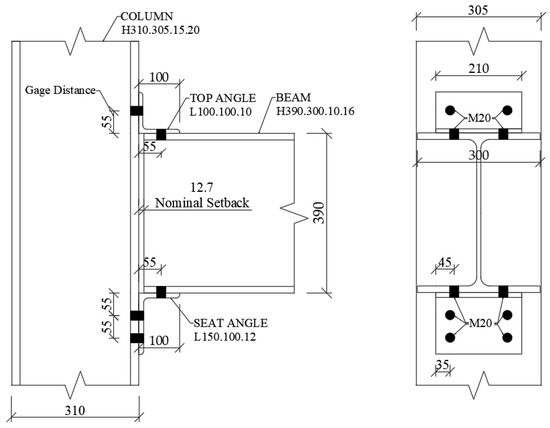 - Yang, J.-G.; Choi, J.-H.; Kim, S.M. A finite element model for the prediction of the behavior of an unstiffened top and seat angle connection with various top angle bolt gage distances. J. Asian Archit. Build. Eng. 2011, 10, 367–374. [Google Scholar] [CrossRef]