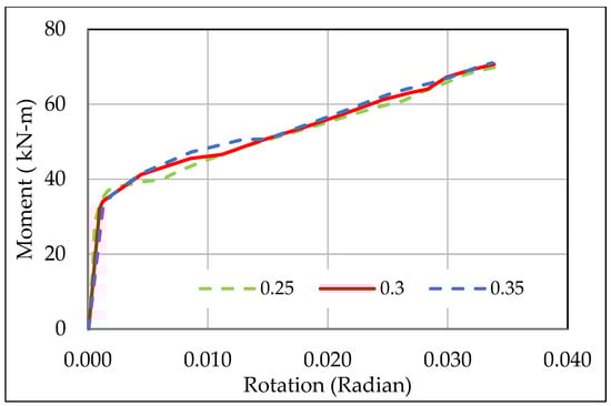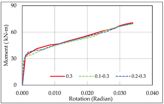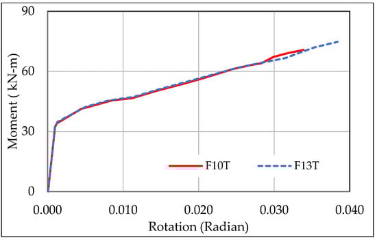 - When the friction coefficient was reduced, a slight increase in the initial stiffness was obtained in the linear range of the M–θ curve, while a decrease in the ultimate moment of TSACs was observed. Conversely, when the friction coefficient was increased, a small decrease in the initial stiffness was determined, whereas the ultimate moment value for the TSAC was similar to that of the model with a friction coefficient of 0.3. Additionally, using two different friction coefficients between connection components in the FE model resulted in a little increase in the initial rotational stiffness, however, the ultimate moment values were almost the same.