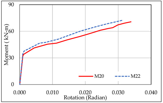 - Within the nonlinear region of the M–θ curve, the yielding of the angles followed by the yielding of the bolts leads to the formation of plastic deformations and eventually to the connection reaching its ultimate moment. In this range, an increase in bolt diameter results in higher strain hardening stiffness and moment capacity.