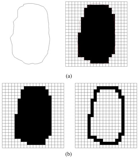 (a) Digitization of a real object. The grid or resolution is usually the compromise between the accuracy required and the computational cost involved. (b) Only the outline of a solid object is actually needed when moving it around and detecting overlaps it may have with others. This dramatically increases the speed of the packing algorithm [].