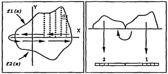 Cundall and Strack [] initially introduced discrete elements as a means to model particle shapes. Building upon this concept, Williams and O’Connor [] proposed the discrete function method, which involves unfolding the aggregate surface and uniformly selecting discrete points along the X-axis to discretize the aggregate surface function as shown in Figure 5. For three-dimensional particles, there are two types of discrete functions. The first type is a uniform discretization method that can be applied to particles of any shape. It discretizes the aggregate function based on the angles and in the spherical coordinate system. The second type is an adaptive discretization method specifically designed for superquadratic particles as introduced by Hogue []. This method allows for the densification of discrete points at sharp vertices or corners. It ensures that the discretization captures the intricate details of the particles’ surfaces. X-ray CT and 3D optical scanner are also used to obtain the discrete points [].