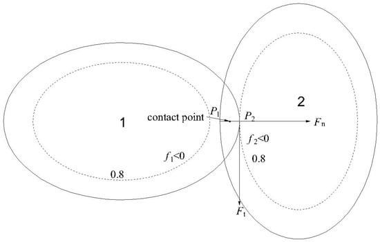Ng [] and Ting [] introduced the concept of the geometric potential as a means to detect collisions between aggregates. Figure 7 illustrates their approach, where a set of concentric ellipses is constructed both inside and outside the examined ellipse 1 and ellipse 2. Points lying on the same concentric ellipse exhibit identical geometric potential. Specifically, the geometric potential of points located within ellipse 1 and ellipse 2 is negative, whereas the geometric potential of points situated outside ellipse 1 and ellipse 2 is positive. Notably, there exists point on ellipse 1, which possesses the lowest geometric potential relative to . If the geometric potential of point to ellipse 2 is less than zero, it implies that lies within ellipsoid 2, representing that a collision has occurred between the two aggregates [].