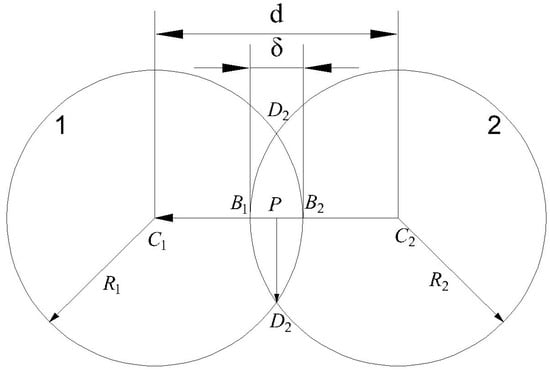 The discrete function method serves as an alternative to the continuous function method by replacing the particle’s surface function with discrete points on the surface. In this method, the invasion of one particle by another is determined by comparing the geometric potential of discrete points on the surface [,]. If the geometric potential of a discrete point on the surface of particle 1 to particle 2 is less than zero, it indicates that the discrete point on the surface of particle 1 has invaded particle 2. Therefore, in the discrete function method, the geometric potential method is simplified, eliminating the need to find the minimum geometric potential point. Instead, the discrete points on the particle surface are traversed to identify any points that have invaded other particles [,,].