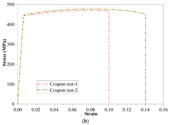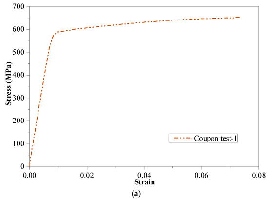 For modelling the isotropic yielding and plastic hardening of the steel material, the metal plasticity model provided in ABAQUS was implemented. Because the consideration of strain hardening was omitted, the stress–strain curve utilized in FE models was rendered easier and characterised as bilinear. The numerical model used the material parameters deduced from the coupon testing outcomes [6,7]. An effective stress–strain profile was obtained by converting the engineering material plot following specified formulas outlined in the manual [29]. The computation of true stress (σtrue) and true strain (εtrue) can be accomplished by