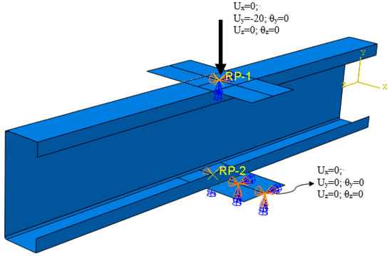 The boundary conditions shown in Figure 4 were employed in the FE models. The axial force was introduced through a reference point positioned on the top plate, adopting the general static approach with displacement control [29]. With the exception of the translational motion along the Y axis, every degree of freedom on the upper surface of the end plates was limited. This ensured that no object passed through these two contacting surfaces. In this investigation, modelling the aluminium alloy C-section used implicit dynamic analysis and elastic buckling analysis. The quasi-static responses of the models were computed using the dynamic method incorporating implicit temporal integration.