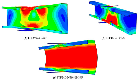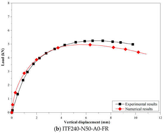 The shapes of deformation obtained from the numerical investigation are demonstrated in Figure 5. Predictions of the shapes of deformation through numerical simulations were observed to be comparable to the ones that were actually seen during the experiments. In Table 2, it can also be seen how the numerical results (PFEA) relate to the experimental outcomes (PEXP). The mean and coefficient of variation (COV) of PEXP/PFEA were determined to be 1.00 and 0.04, as shown in Figure 6, demonstrating that the FE models in this work could accurately predict the web buckling behavior of aluminium C-shaped components. The load–displacement curves produced by the numerical modelling and tests for the specimens ITF20030-N150 and ITF240-N50-A0-FR, respectively, are also shown in Figure 7a,b. This shows that there was good agreement between these curves’ predictions of initial stiffness and final strength.