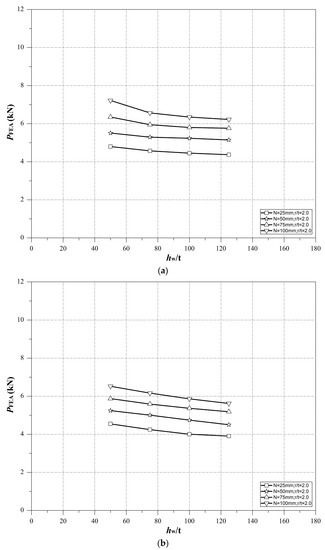 As depicted in Figure 8, the way in which the ratio hw/t could affect the web bearing capacity of high-strength aluminium channels was comprehensively analysed. The outcomes revealed that, on average, there was a 9.7% reduction in the web buckling behaviour of C-sections made from 7075-T6 when hw/t escalated from 50 to 125. Similarly, the strength experienced an average decrease of 13.4% for AA-6086 aluminium in the same hw/t ratio range. This observation underscores the importance of accounting for the influence of hw/t while designing structures composed of HA.