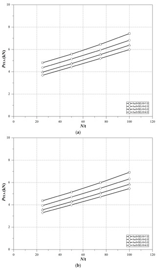 The effects of N/t on the web bearing capacity of high-strength aluminium channels were investigated, as depicted in Figure 9. Notably, elevating the N/t ratio from 25 to 100 yielded an increase in web buckling behaviour. Specifically, the data indicated that, on average, the web bearing capacity experienced a 36.8% increment for 7075-T6 aluminium and 38.3% for AA-6086 aluminium. The observation emphasises the necessity to account for the effect of the N/t in the context of web buckling behaviour, which in turn is significant when we are devising novel design equations for HA C-sections.