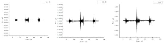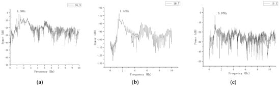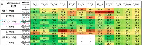 - TZ_10 and TZ_30 working conditions: when the shaking table was tested under 10 Hz and 30 Hz Z-directional sine waves, the vertical vibration-weighted acceleration level of the first floor of the civil engineering building was relatively the largest, 101.1 dB and 101.2 dB, exceeding the limit value by more than 15 dB.