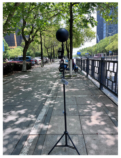Because the research focused on pedestrian thermal comfort, the test instruments were mounted on tripods so that the black ball of the temperature acquisition recorder and the sensor of the hand-held temperature and humidity anemometer were 1.5 m above the ground (Figure 4), and the test data recording interval was 1 min. At each measuring point, three groups of data were measured, and the average value of the three groups of data was used to calculate the average data per hour.