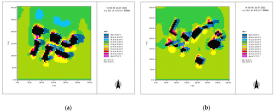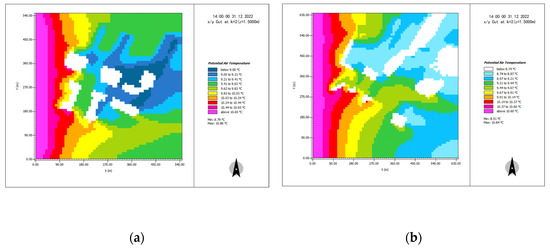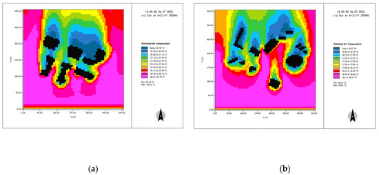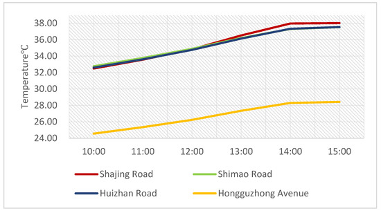 The incoming flow temperature of the Shimao Road–Shajing Road area and Huizhan Road–Hongguzhong Avenue area was around 38.70 °C, according to the simulation results, and their internal temperatures were lower than the incoming flow temperatures (Figure 15). The temperatures of Shajing Road in the Shimao Road–Shajing Road area were 37.13–38.75 °C in the north–south direction and 36.59–37.67 °C in the east–west direction. The temperature of Hongguzhong Dadao in the north–south direction in the Huizhan Road–Hongguzhong Avenue area was 37.05–38.66 °C, while that at Huizhan Road in the east–west direction was 36.52–37.32 °C, with a difference of 0.00–2.14 °C. Overall, the simulation results for the Huizhan Road–Hongguzhong Avenue area are comparable to those for the Shimao Road–Shajing Road area. The east–west street valley had a lower average temperature than the north–south street valley, and the high-temperature area of the east–west street was primarily concentrated in the gap between the buildings along the street. Although the temperature of the north–south street varied, the high-temperature area appeared primarily at the intersection in the inflow direction, and the temperatures of the other areas were within 1.00 °C of the temperature of the east–west street.