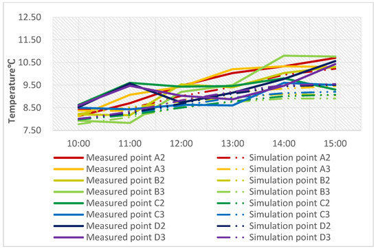 The figure depicts the air temperature distribution 1.5 m above the ground at 10 a.m. and 2 p.m., as well as the statistics of the measured and simulated temperatures at each measuring point (Figure 5). The difference between the simulated temperature and the measured temperature during the day was small, as shown in the figure, and the temperature in the east–west direction was obviously higher than that in the north–south direction, while the temperature on the east–west street was higher than that in the north–south direction. The difference was mostly within 1 °C, but at 2 pm, there was a deviation of about 1.8 °C at the measured temperature (Figure 6).