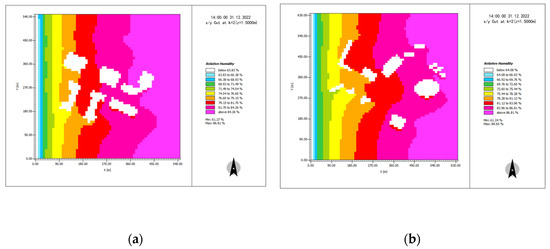 (a) Simulation of the air humidity in Shajing–Shimao Road at 14:00 in winter. (b) Simulation of the air humidity at 14:00 in winter on Huizhan–Hongguzhong Avenue.