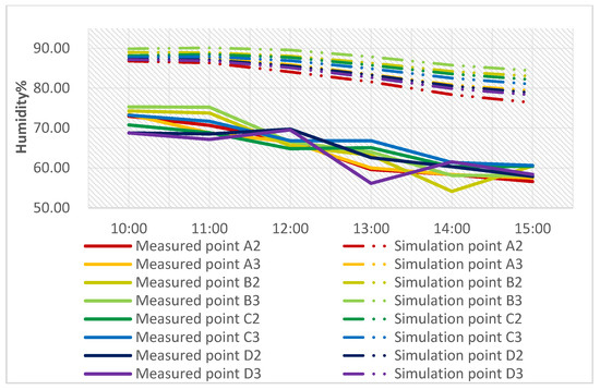 Comparison of the simulated and actual measured hourly humidity at individual measuring points.