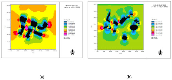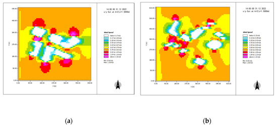 (a) Simulation of the air wind speed at 14:00 in Shajing–Shimao Road in summer. (b) Simulation of the air wind speed at 14:00 in summer on Huizhan–Hongguzhong Avenue.