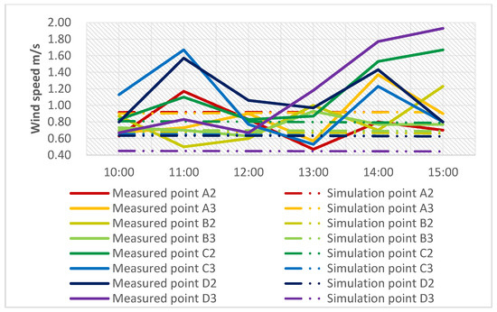 By comparing the measured and simulated wind speed data of each measuring point at 10:00 and 15:00 in the streets, it was found that the difference between the simulated and measured wind speed lay in its stability, and the measured values were more volatile, while the simulated values tended to be more stable. However, the measured values of the change trend of the overall wind speed were roughly consistent with the simulated values (see Figure 9 and Figure 10).