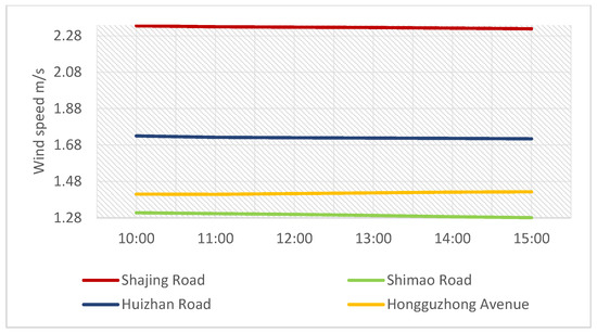 The simulation results show that the areas of Shimao Road–Shajing Road and Huizhan Road–Hongguzhong Avenue were all southerly, with wind speeds ranging from 1.68 to 2.10 m/s. Inside the street, the wind environment was relatively large, with noticeable differences between regions (Figure 16). Among them, the north–south Shajing Road in the Shimao Road–Shajing Road area conformed to the incoming wind direction, and most of the wind speeds were 1.65–1.95 m/s, but it is easy to form a wind field with wind speeds of 2.32–2.98 m/s with the blocking of buildings on both sides, which had a significant environmental impact. However, the east–west World Trade Road deviated from the incoming wind. The north–south direction of Hongguzhong Avenue in the Huizhan Road–Hongguzhong Avenue area also conformed to the incoming wind direction, with a relatively high wind speed. However, because the road is relatively wide, the blocking effect of buildings was minimal, and there was no wind field with high wind speeds, as there was on Shajing Road. The overall wind speeds were 1.26–2.10 m/s, with a local increase to 2.10–2.52 m/s. However, the east–west layout of Huizhan Road is fundamentally similar to that of the World Trade Road. The wind speeds were relatively high in the gaps between buildings along the street, reaching 2.10–2.52 m/s, while the wind speeds were relatively low in other areas, with overall wind speeds of 0.42–1.26 m/s.