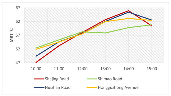 According to the simulation results, the average radiation temperatures outside the Shimao Road–Shajing Road area and the Huizhan Road–Hongguzhong Avenue area were about 63.75–64.82 °C, while the average radiation temperature inside the street was significantly higher than that in the external environment, and the street temperatures in all directions were similar, with the only relatively low-temperature area being near the north of the building (Figure 17). The average radiation temperatures of Shajing Road in the north–south direction in the area of Shimao Road–Shajing Road were between 65.24 and 66.44 °C. The average radiation temperatures of World Trade Road in the east–west direction were 56.86–59.25 °C in the area near the north of the building, while the rest were between 65.24 and 66.44 °C. The average radiation temperatures of Hongguzhong Avenue in the north–south direction were between 64.67 and 65.82 °C in the area from Huizhan Road to Hongguzhong Avenue, and the average radiation temperatures of Huizhan Road in the east–west direction were 56.65–57.79 °C in the area near the north of the building, while the rest were between 64.67 and 65.82 °C. The area of Huizhan Road–Hongguzhong Avenue was slightly better than that of Shimao Road–Shajing Road, and the average radiation temperatures at the intersection in the middle were between 64.04 and 65.24 °C.